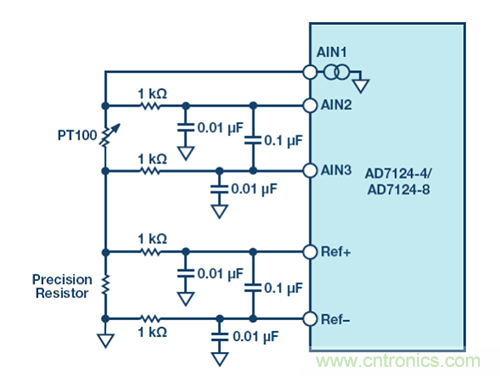 选择适当的外部精密电阻值,使 RTD 上产生的最大电压等于基准电压除以 PGA 增益。