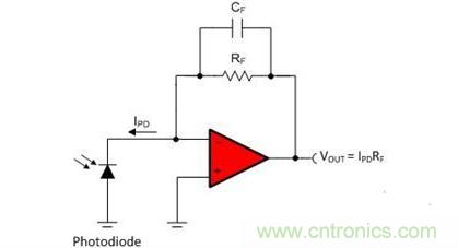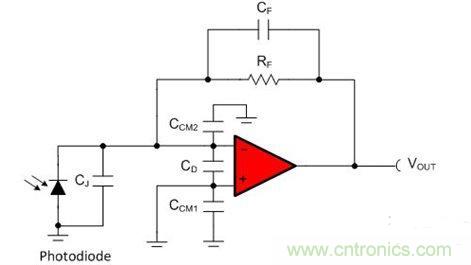 图1:反馈电容器CF补偿光电二极管接触电容和运算放大器输入电容