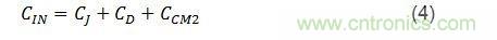 从图中可以清楚地看出,CJ、 CD和CCM2是并联,因此反相输入端电容为: