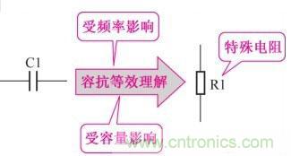 电容让交流电通过的同时对交流电流起到阻碍的作用,就同电阻阻碍电流一样,所以在大部分的电路分析中,能够将电容在电路中的作用当作一个“特殊”电阻来等效理解,称为容抗。