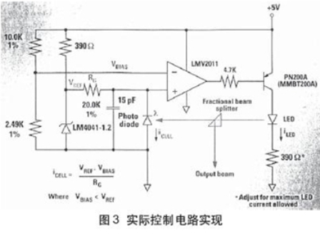图2示出采用运放的电路,用于分析控制环路。此电路驱动1个PNP晶体管,此晶体管为产生光发射的LED提供电流。光发射照射到光电二极管,光电二极管把光发射转换为非常小的电流(通常为10mA)。在这种情况下,二极管用在反向模式,所以在无光呈现时,电流为零,但是光电二极管和放大器中的漏电流(也称之为“暗电流”)是过载。此条件牵引由晶体管基极电阻所限制的电流,开始时晶体管处于饱和状态。一旦电流开始流经晶体管,则LED或激光二极管将开始发射光。光电二极管把此部分光转换为电流,流经RG。随着电压趋于VBIAS(在图2中为地),环路将闭合并保持驱动晶体管的电流来维持LED中的电流以保持恒定光强度(或光电二极管中的电流)。此构成电路DC分析的基础。图3为用NS公司LMV2011精密运放实际实现电路。用NS的LM4041-1.2并联基准产生基准电压,提供固定的1.225V基准电压。设置基准中的电流在10mA左右,这是工作电流的中间值。由两个1%精度电阻器产生VBIAS,其值设置在1V左右。为了计算闭合控制环路中的光电二极管电流,VREF和VBIAS之差除RG。注意,为了此电路工作,VBIAS必须小于VREF。对于10mA光电二极管电流,RG为0.2×10E-6或 20.0KΩ。4.7KΩ电阻器限制PN200A PNP晶体管基极电流,设置在1mA左右。晶体管b值为100左右,所以晶体管可提供的最大电流为100mA左右,这超过了微型SOT-23封装的热耗。为了避免晶体管的热击穿,用与LED或激光二极管串联的电阻器限制晶体管集电极电流。若需要更大电流,则具有较大集电极电流的晶体管应该用较大的封装(如SOT-223)。为限制电路带宽以保持稳定性,用与光电二极管并联的15pF电容器使放大器滚降频率在250KHz左右。