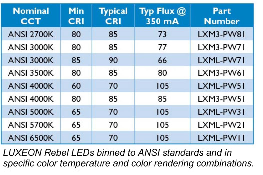 这九款新的LUXEON Rebel LED产品根据美国国家标准化组织(ANSI)的标准进行电阻分档,均达到了最低规定演色系数。每一款产品的光输出和光通维持率均达到了ENERGY STAR®和其他光效标准。另外,新产品也具备其他LUXEON Rebel系列产品所公认的高效,长使用寿命及高可靠性的特点。