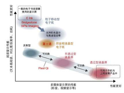 具体来说,日本Bridgestone公司与美国SiPix Imaging公司等多家厂商已经开始为电子书阅读器提供电子纸。美国初创企业Pixel Qi公司也开始提供具有专门设计的电子纸显示模式的液晶显示屏。
