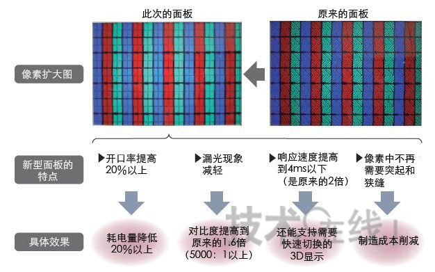 与原来相比,此次的液晶面板具有四大特点。即:耗电量低、对比度高、响应速度快、制造成本低。