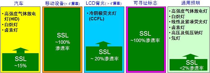 如今,在屏幕尺寸小于4英寸的手机、相机闪光等移动设备应用中,及路边及体育场中大型显示屏应用中,LED照明,或称固态照明(SSL),几乎占据了100%的份额。除此之外,LED照明也向其它领域迈进。如在汽车应用中,LED照明占据约15%的份额。而在较大液晶显示屏(LCD)背光应用中,虽然冷阴极荧光灯(CCFL)如今仍然占据主导地位,但LED照明的总渗透率也达到约20%,参见图1。特别是在备受瞩目的大尺寸液晶电视背光应用中,据Laurent Jenck指出,预计LED背光的液晶电视在未来3到4年间,将占据至50%的份额。