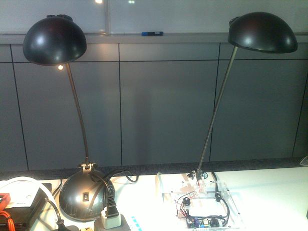 现场,Laurent为我们演示了用LED模块代替卤素台灯在能效方面的差异,如下图所示:可以看出,使用LED灯作台灯的能耗仅相当于卤素灯的1/4。