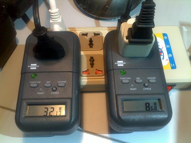 图4.左边为卤素台灯的能耗为32.17W,右边为LED灯的能耗为8.68W