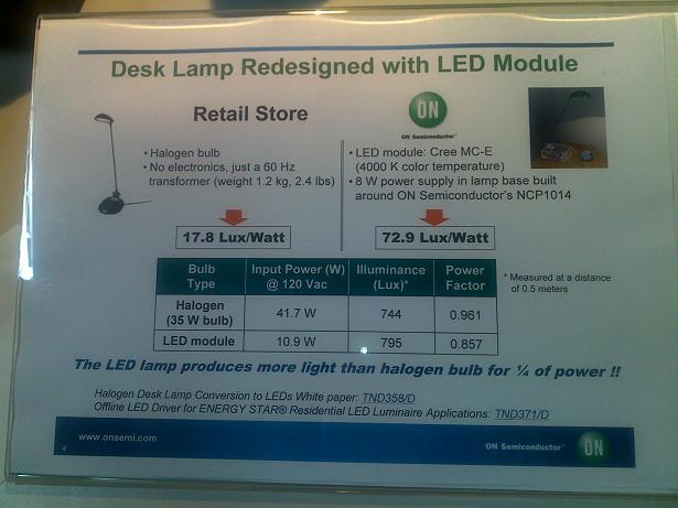 相比较而言,LED照明在灯泡、嵌灯、街道及区域照明、任务灯、景观照明、商业建筑物照明及广告牌文字电路照明等通用照明领域的渗透比例还偏低,目前小于2%,远低于其它照明类型。但LED照明具有高能效等优势,让其在通用照明市场也极具应用潜力。例如,安森美半导体对从零售商店购得的一款卤素台灯(采用35 W灯泡)进行重新设计,原卤素灯中无电子组件,仅含1个较重的60 Hz变压器。这卤素灯在120 Vac条件下的输入功率为41.7 W,在0.5米距离处测得的光亮度为744流明。重新设计的台灯采用LED???,灯底部采用安森美半导体NCP1014自供电单片式开关稳压器,在120 Vac条件下输入功率为10.9 W,即能耗仅相当于卤素灯的1/4;同时,这LED台灯在同等距离条件下测得的光亮度为795流明,更优于卤素灯,其72.9流明/瓦(lm/W)的能效(efficacy)更是数倍于卤素灯(17.8 lm/W)。