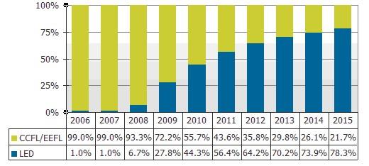 2006-2015采用传统CCFL&EEFL灯管与LED背光大尺寸液晶面板出货比率预测