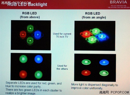首先从RGB三色LED的排列顺序上来看,新一代的“动态丽彩LED背光源”采用了正方形排列,上下的LED颗粒不再像上一代那样交错分列,这样的排列方式可以将整个屏幕实现更为精确的区域划分,为下一步的区域条光埋下伏笔。