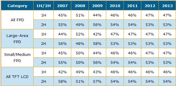 表一 2007-2013全球平面显示产业上下半年市场份额