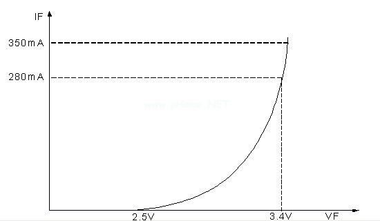 目前的新技术使LED能够达到很高的功率水平,LED的功率能够达到1W,甚至有些达到5W,光效达到60-85LM/W,这种LED设备称为高亮LED(HB-LED)。目前我们用在照明上LED都是HB-LED,一般都是选择1W的LED通过串并联的方式组成大功率LED灯,尤其以串联为主。这种LED的为3.4V±2%,正向电流为350mA左右。其-曲线如图1.1所示。