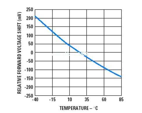 从图1.2可以看出,随着温度的上升,会逐渐变小,相反,当温度降低时,会增加。当LED的温度上升到85度时,已经有变成3.25V(3.4V-0.15V),相反当LED温度降到-40度时,变成3.6V(3.4V+0.2V)。