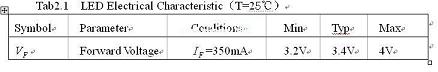 其次,恒功率控制都是预先假定输出功率是恒定的,比如用9个1W(=3.4V, =350MA)的LED串联起来用做一个9W的PAR灯,那么设计时候就会用=9W来计算。但实际上每个LED的都会偏差,偏差值如表2.1所示: