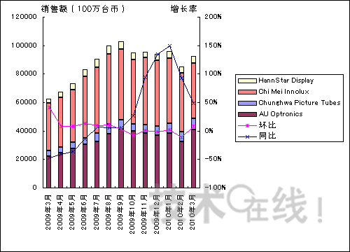 2010年3月台湾四家大型液晶面板厂商的销售额环比增加了9%。2010年3月18日由台湾群创光电(Innolux Display)、原奇美电子(ChiMei Optoelectronics)和统宝光电(TPO Displays)合并成立的台湾奇美电子(Chimei Innolux,CMI)3月份的销售额不包括原奇美电子和统宝光电3月1日~3月17日的销售额。如果加上这部分销售额的话,预计四大厂商的合计销售额将环比增加25%左右。
