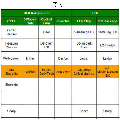 2. 目前正处于CCFL与LED背光产品世代交替之时, 整机厂商应积极主动掌握LED背光资源,逐步取代CCFL,均衡健康的完成内部供应链结构以及生产制造工序的调整。