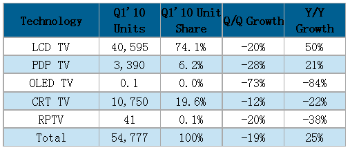 - 2010年第一季所有种类电视机出货量较去年同期成长55%