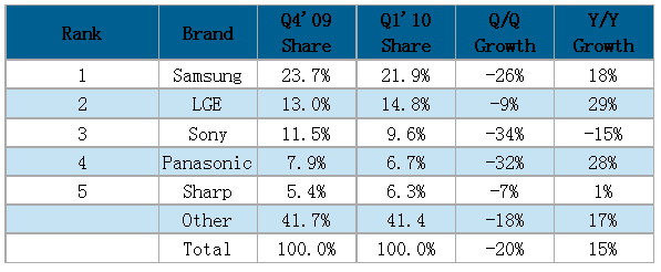 一季度三星电子(Samsung)出货营收比率较去年第四季稍微下滑,不过利润率相对较其它厂商好,出货金额比率达21.9%。同时三星电子持续在新技术如LED与3D电视方面领先其它厂商,这也是该公司持续良好增长与较高产品价格主要原因。以应用技术别来看,三星电子在LCD TV全球排名第一,在等离子电视则排名第二。