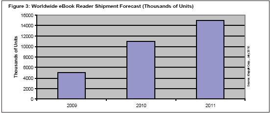 iSuppli公司预测,2010年全球是电子书阅读器出货量将增至1100万个,比2009年的500万个增长120%,如图3所示。目前,iSuppli公司无意大幅改变这个短期预测。