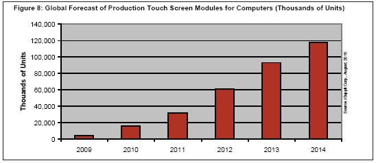 iSuppli公司预测,2014年用于电脑的触摸屏模组全球产量将大增到1.179亿个,而2010年是1580万个。图8所示为iSuppli公司对用于电脑触摸屏全球产量的预测,包括台式机、移动PC和slate以及平板电脑产品。