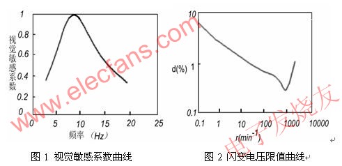 可以被人眼感知的光源闪烁,可以通过统计的方法来测得人眼的对光源闪烁的感觉特性。图1是人眼对不同频率的电压波动引起的视觉敏感系数曲线。从曲线上可以看出最敏感的频率是8.8Hz,偏离该频率后,敏感度随频率而降低。当闪烁频率40Hz以上时,感觉就不灵敏;50Hz以上的闪烁就完全没有感觉。