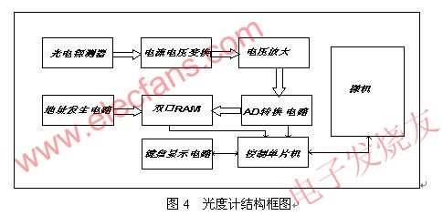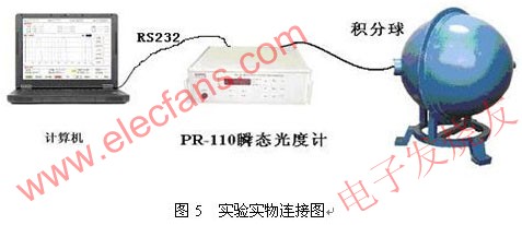 为了精确测量光通量,把光源放在积分球中。经过V(λ)校准的光电探测器接受光信号,其输出的电信号经过放大转换电路,将光电探测器输出的光电流信号转换成较大的电压信号,利用AD转换器进行采样。由于单片机读取和存储数据速度较慢,故而采用了双口RAM和地址发生电路,使得光度计能够在采用时自动对数据进行存储。单片机则在所有采样过程执行完毕后,再从双口RAM内读取数据,并发送给微机显示处理。系统结构图和实物连接图如下。