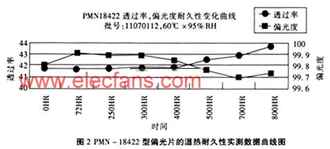 耐湿热技术指标是指偏光片在恒温恒湿条件下的耐湿热工作性能,它也通常分为三个技术等级,既通用型:湿热工作条件为40℃×90%RH×500HR;中耐久型:湿热工作条件为60℃×90%RH×500HR;高耐久型:湿热工作条件为:70℃×95%RH×500HR以上。由于构成偏光膜的基本材料PVA膜和碘及碘化物都是极易水解的材料,同时也由于偏光片所使用的压敏胶在高温高湿条件下也容易劣化,因此,在偏光片的耐久性技术指标中最重要的就是耐高温和耐湿热指标,如果耐高温和耐湿热指标通过,其它耐久性型指标通常都不会发生问题。“福地”牌通用型PLN产品和中耐久PMN产品都能够很好地满足各自相应技术等级所规定的耐久性技术指标的要求(见图2)。