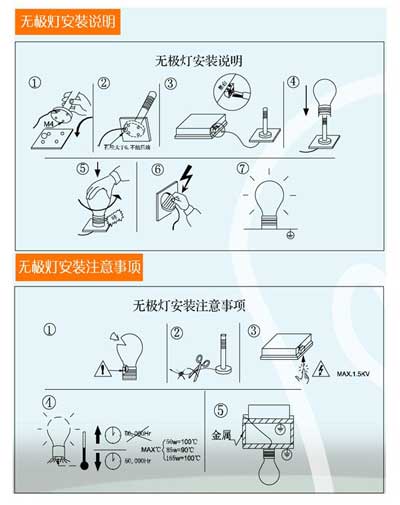 2)工作时环境温度不得超过50℃; 3)必须与无极荧光灯灯泡正确连接后,方可接通电源;