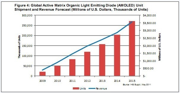 AMOLED正在迅速成为智能手机青睐的显示器,2010-2015年全球出货量将扩张近五倍。