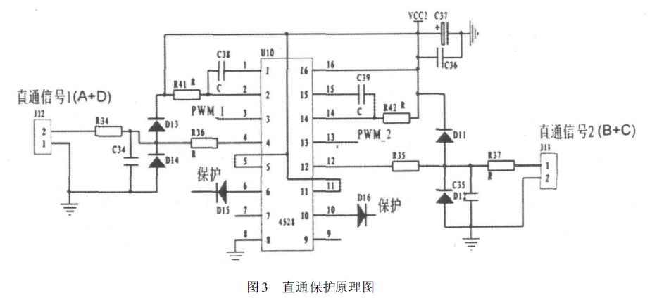 主电路中的左右桥臂对称,就左桥臂的直通?;そ蟹治?。 正常状态下,当Q1、Q4导通时,PWM1为高电平,PWM2为低电平,3脚高电平输入有效,A点和D点没有电流流过,不会触发单稳态;虽然B点和C点采到了正常输出的上升沿信号,但是13 脚低电平时输入无效,所以不会触发单稳态,没有?;ば藕攀涑觯?而在直通时,Q3由于某种原因误导通了,A点将检测到很大的电流上升率并转换为电压信号; 此时PWM1为高电平,图3中左边的单稳态被触发产生?;ば藕潘偷絇WM 芯片的shutdow n 端,封锁PWM 脉冲输出。