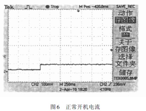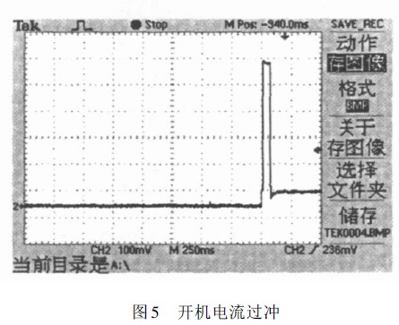 开机时,由于电源滤波电容大,以及各延迟环节使得电流采样反馈值与给定值在调节器输入端不同,这会使得负载电流上升过冲,实测过冲波形如图5所示。 为了解决这一问题,可以将调节器给定端RC 的值适当加大,调节以后的开机电流没有发生过冲,波形如图6.