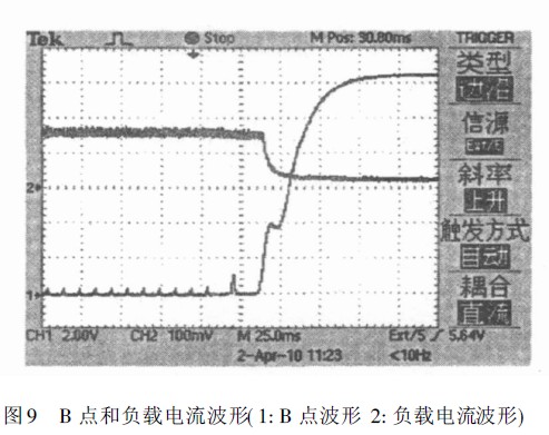 光耦U1、U 2 随被测电源的正负半周交替导通,当A 点交流电压大于光耦中发光二极管的导通电压Von时,光耦开启,C3通过光耦中三极管放电,使B 点的电压达不到场效应管的开启电压; 当交流电压小于Von时,光耦不导通,C3充电,B点的电压增加,此时应使C3的电压上升到场效应管阈值的时间大于光耦关闭的时间,以保证Q2不导通。 在t1时刻交流电源断开,光耦输出呈高阻态,C2中存储的电荷经R1向C3充电,C3上的电压迅速增加,当B点电压大于场效应管的开启电压时,场效应管Q2导通,导通后可迅速将Vs 拉低,图8中Vs是调节器的给定输入端电压。 关机瞬间负载电流和图8中B点的波形如图9。改变R1和R4的参数,可以改变给C3充电的时间。 R4选用较大阻值的,可以提高C3上的电压,同时延长C3的放电时间。 C2的大小可以决定交流电源断电后维持该电路工作的时间。 综上所述,设置合理的参数,便可保证在主电路电源没有完全关闭的情况下,Q2一直导通,即误差放大器的给定输入端一直为零,避免了电流过冲。