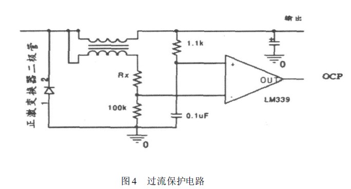 这里采用如图4的方法,在正激变换器扼流圈放置相同匝数的线径较细的线圈。 这两个绕组是磁平衡的,它们之间本应没有电压差。 但是主绕组有直流电阻,大电流时产生了微小的电压差,该电压差由负载电流决定。这个微小的电压差被运放检测,并且通过调节Rx可以设置电流限制。该电路的缺点是电流限制不是很精细的,这是因为铜电阻在温度每上升10℃时增加4%。但是这个电路依然可以满足我们的设计要求。