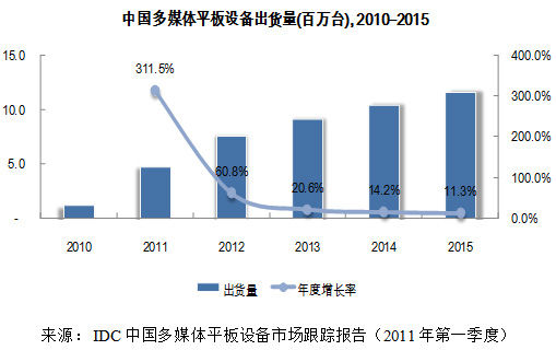 IDC 19日晚间发布的报告称,2011年第一季度中国多媒体平板设备市场总出货量达到85.5万台,和2010年第四季度相比增长仅为5.3%,低于预期水平。