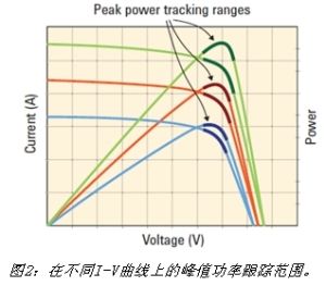 如果目标是为了验证峰值功率追踪电路的性能,开发出能在不同环境条件下始终工作在I-V曲线最大功率点上的太阳能逆变器,在电路的设计和开发中就必须考虑峰值功率跟踪范围和跟踪频率。峰值功率跟踪范围是I-V曲线最大峰值功率点附近的一段区间,这也是逆变器峰值功率跟踪电路算法的工作区间,跟踪频率则是工作区间内曲线的摆动速率,如图2所示。为确保逆变器在??镮-V曲线变化时始终能够找到最大峰值功率点,它必须具有足够宽的跟踪范围和足够高的跟踪频率。为验证设计的有效性,需要根据精确复现太阳能电池板的I-V曲线来验证在不同曲线下逆变器能否稳定地工作在峰值功率点附近。