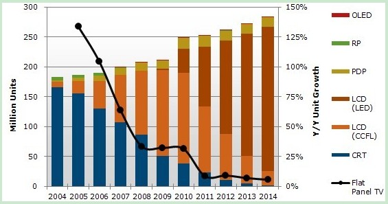 液晶电视市场份额持续上升,目前占比为84%.出货量预计将由2010年的1亿9千2百万台上升到今年的2亿1千万台。但低于原先预期的2亿1千7百万台,这也直接导致全球电视总出货量减少。