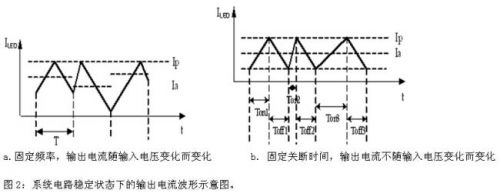从电感的计算公式可以看出这两者之间的差异性,图1a中的电感计算式为L = (Vin–Vo) * Ton /ΔI ,图1b中的电感计算式为L=Vo*Toff/ΔI。Io=Ip-ΔI /2。如图2所示电流波形示意图,电感确定后,图2a中输入电压Vin变化导致纹波电流ΔI变化,以致输出电流变化;图2b中的纹波电流ΔI与输入电源电压无关。因此在电压波动较大的宽电压应用环境下,使用恒定关断时间电路方式。