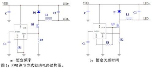 按照PWM调节方式,可以分成恒定频率和恒定关断时间两类(图1)。