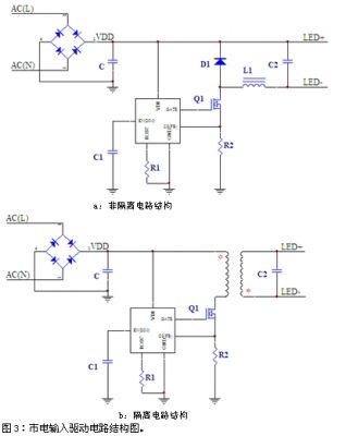 隔离和非隔离驱动方式主要针对市电交流输入而言。当采用图3a的非隔离方式时,建议工作在电流连续模式;当采用图3b的隔离方式时,建议变压器工作在非连续方式(即每个周期结束时,变压器无剩磁),这样可以保证每次开关周期,变压器原边传送给副边的能量相同(与电源电压无关)。