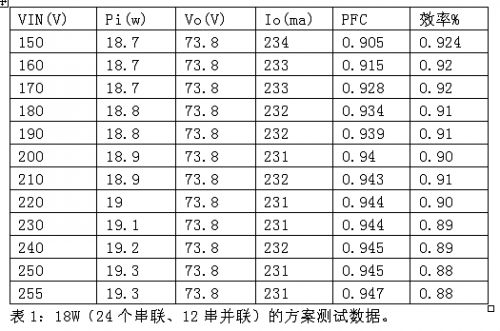 在AX2028_TUBE_18W非隔离应用设计(图4)中,LED光源阵列设计为0.06W白光LED(SMT或草帽灯)24个串联、12串并联的方案,驱动288个小功率WLED,总功率为18W。