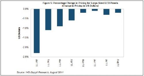 据IHS iSuppli公司的液晶显示器(LCD)价格研究报告,8月份大尺寸LCD面板价格下降速度预计略慢于7月,供应商积极降低产能利用率预计会防止面板价格进一步下滑。