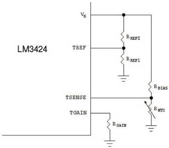 为了实现根据温度调节LED电流的目标,可以使用多种不同的方法。一种方法是构建温度感应电路,用于驱动LED驱动器集成电路的模拟电流调节针脚。更简单的解决方法是使用LM3424等具有内置热返送功能的LED驱动器集成电路。图2显示了LM3424热返送功能所需的外部零部件示例。