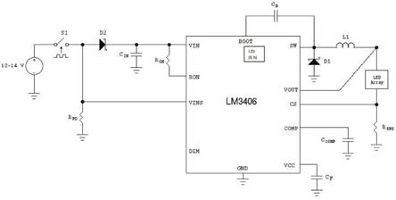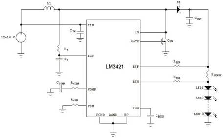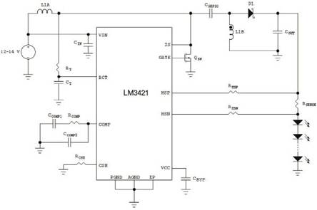 美国国家半导体的产品包含可实现多种拓扑结构的众多开关稳压器集成电路。此外,美国国家半导体专为LED应用开发了一系列集成电路,其中很多具有适合汽车电子系统应用的功能。本文将探讨几个汽车电子系统大灯驱动的应用示例。