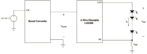 根据具体的设计,上述问题的影响可能可以忽略。但是,如果系统设计师对上述影响存有顾虑,可以采用单个串联灯组作为首选拓扑结构。在这种解决方法中,仍可以使用LM3406等部件,但将增大系统复杂性,因为需要新前端部件用于传输超出12V~14V的电源电压为LED驱动器供电。然后,LED驱动器降低此新电压,为单个LED灯组供电。这可以通过在直流电源和LM3406之间增加升压DC/DC功率级轻松实现,如图10所示。通过此拓扑结构,串联灯组中的所有LED均具有相同的电流,无论各LED的VF值是多少。