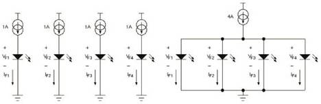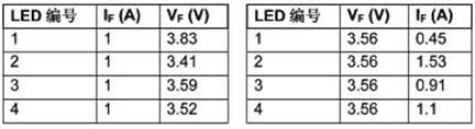 下例显示了VF变化的影响。在实验中,使用图9所示两种设置收集数据。一种设置用于4个LED,另一种设置用于并联的4个LED。表1所示数据在25℃加电后5秒内测得,以最大限度降低LED自发热的影响、