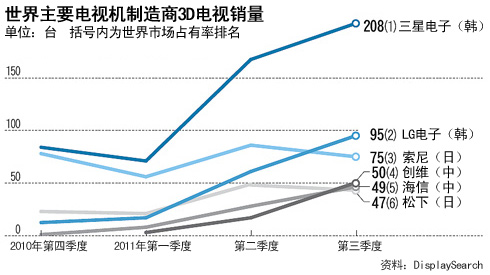 据市场调查机构Display Search 20日公布的《第三季度世界3D电视销量》显示,中国有4家企业进入前十,分别是创维(50万台,第4位)、海信(49万台,第5位)、长虹(34万台,第7位)、康佳(27万台,第9位)。