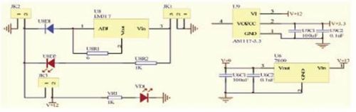 电源采用12V/1000mAh的锂电池,直接为倾角传感器供电,再经两路DC-DC转换,分别转换至9V和3.3V,9V电源为无线数传??楣┑?,3.3V为主控制器及接口电路供电,充电电路采用LM317芯片,恒流方式充电。电源电路见图4所示。