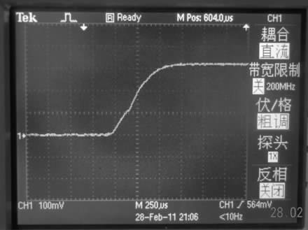 通过模拟可初步选择40 mH 的电感作为驱动电路所用, 图3 是用示波器采到的电压波形图, 此电压是电路中串联了一个20 Ω 的电阻上的电压, 稳定后电压为340 mV, 即电路中电流为17 mA.因为实际电路中电流有损耗, 所以实际电流值比模拟电流值偏小, 但整个电流的变化趋势与模拟基本一致。