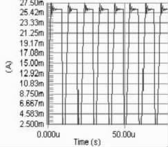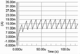 要保证PWM 周期小于电感的τ 时间, 因为若PWM 的周期大于τ, 则极有可能出现在PWM 的占空比变化的情况下, 电路中电流都能达到电感的饱和直流电流, 影响了对LED 电流调节。当C8051330 的时钟频率是25 MHz ,PWM 的周期的选择对电流改变档位的影响很大。若周期越大, 则PWM 占空比的档位越多, 反之越少。拟用256 个档位的占空比, 因此PWM 波的频率应选择在100kHz 以下,即周期在10 μs 以上,直流电感为10Ω, 此时电感值应选择大于0.1 mH.图2 分别是PWM 频率为100kHz , 占空比为90%, 电感为0.1 mH、1 mH 和40 mH 时电路电流值的模拟结果。