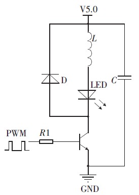 图1 所示为驱动电路, 电感值的选择以及PWM 波的频率选择在此驱动电路中相当重要。选择C8051330 芯片作为PWM 波的输出, 采用定时器翻转控制高低电平的时间,从而控制PWM 波的占空比。
